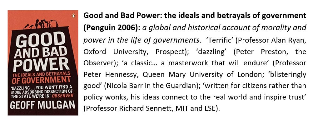 [this is an adapted extract from ‘Good and Bad Power: the ideals and betrayals of government’, published by Penguin. It sits alongside my other writings on government including ‘The Art of Public Strategy’ (Oxford University Press) and ‘Another World is Possible’ (Hurst)]